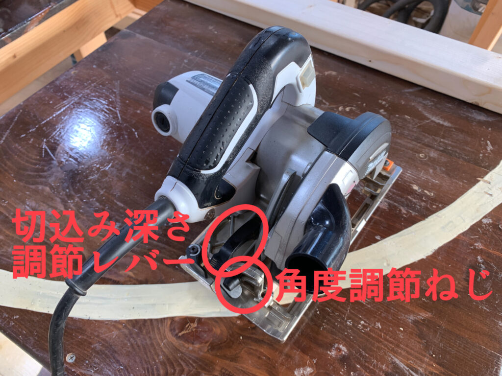 木材を斜めに切るには丸ノコに角度調節ねじが付いているのでここで角度を調整します。斜めにしたら木材が切れる深さの刃を出します。真っすぐ切るより力の掛け具合が変わるので本番の前に試し切りしましょう。