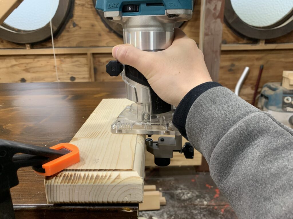 まずクランプ等で材料を固定する。なれべくトリマーベースの根本(下)持ち、電源を入れ最初にトリマーベースを材料にあて次にガイドやトリマーシューをあてていくイメージで材料を手前から奥に切っていく。